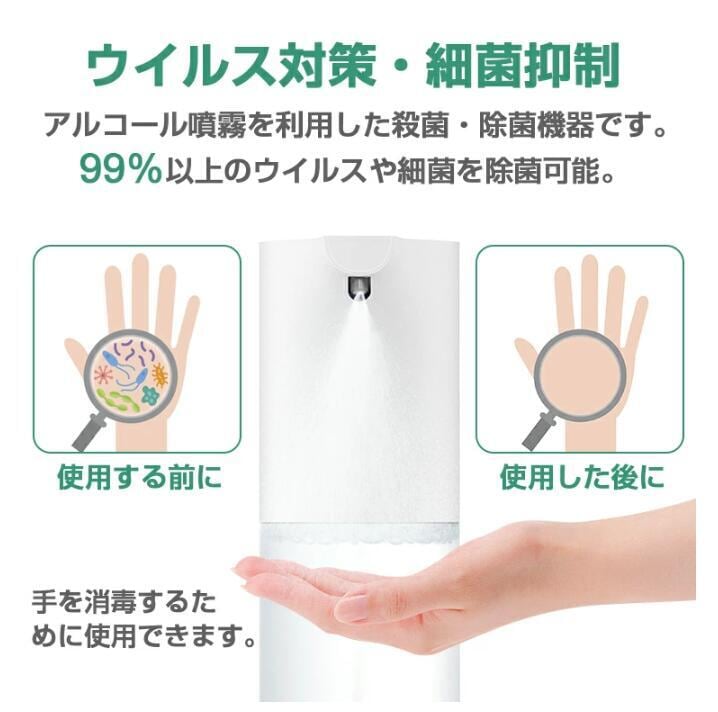 商品名:【2件セット】【最新型-USB充電式】スペンサー アルコール 自動 噴霧器 ハンドアルコールディスペンサー 【最新型USB充電式】 この自動噴霧器は、最新型のUSB充電式設計を採用しています。煩わしい電池交換の手間がなく、どこでも手軽に充電してご使用いただけます。エコな選択でもあり、環境にもやさしい一品です! 【非接触で安心】 手をかざすだけで自動的にアルコール消毒液が噴霧されるため、接触を避けることができ、安心してお使いいただけます。ウイルスや細菌の感染リスクを低減し、特に感染症対策に最適なアイテムです! 【大容量タンク】 このディスペンサーは、大容量のタンクを搭載しており、頻繁にアルコールを補充する必要がありません。商業施設やオフィスなど、たくさんの人が利用する場所でもスムーズに運用することができます。手指消毒を簡単に行えることで、安心感を提供します! 【スタイリッシュなデザイン】 シンプルでスタイリッシュなデザインのため、どんなインテリアにもマッチします。店舗やオフィスの雰囲気を損なうことなく、手指消毒の環境を整えることができます。 北海道・沖縄・離島は別途送料がかかる場合がございます。